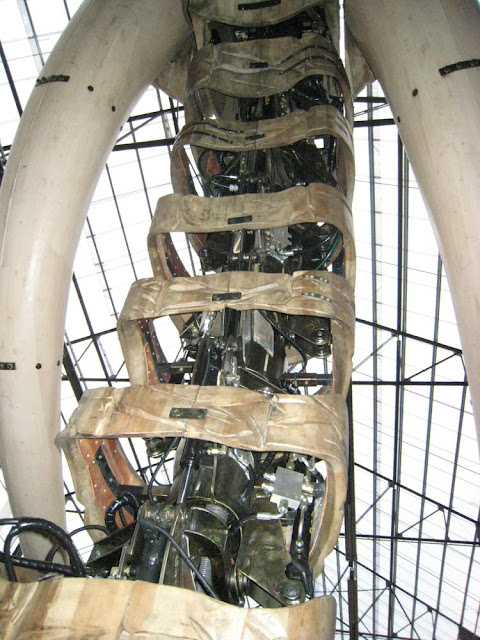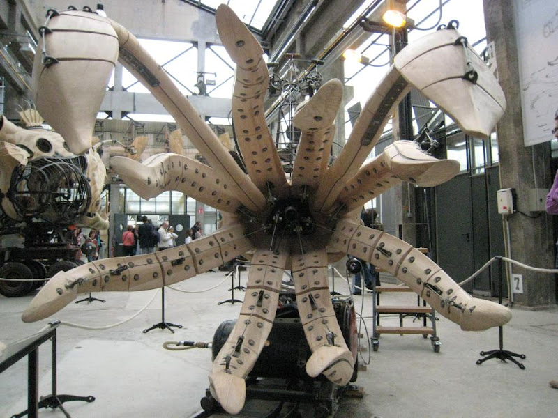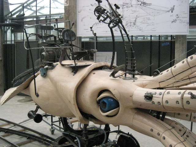 Constructed on the site of the former city dockyards, these steel and wood animal machines consist of the innumerable moving parts, hydraulics, gear wheels - all skillfully combined to make up various obscure sea creatures, a huge elephant, birds and prehistoric monsters... here is a mysterious crane nest: